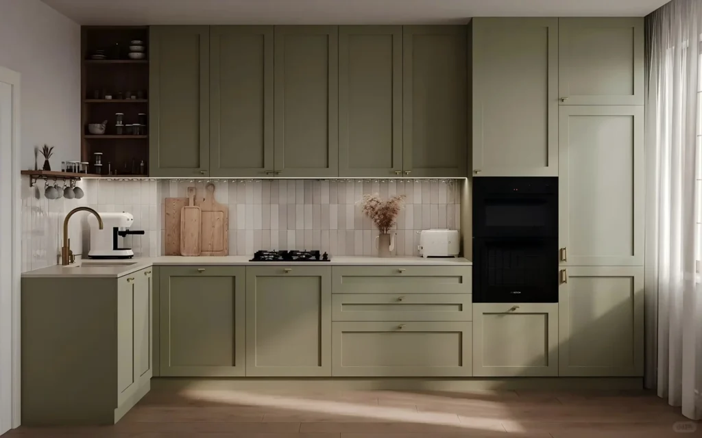 Light sage green suits apartments well. It prevents visual crowding. The color feels calm. The kitchen looks stylish. Space feels open.